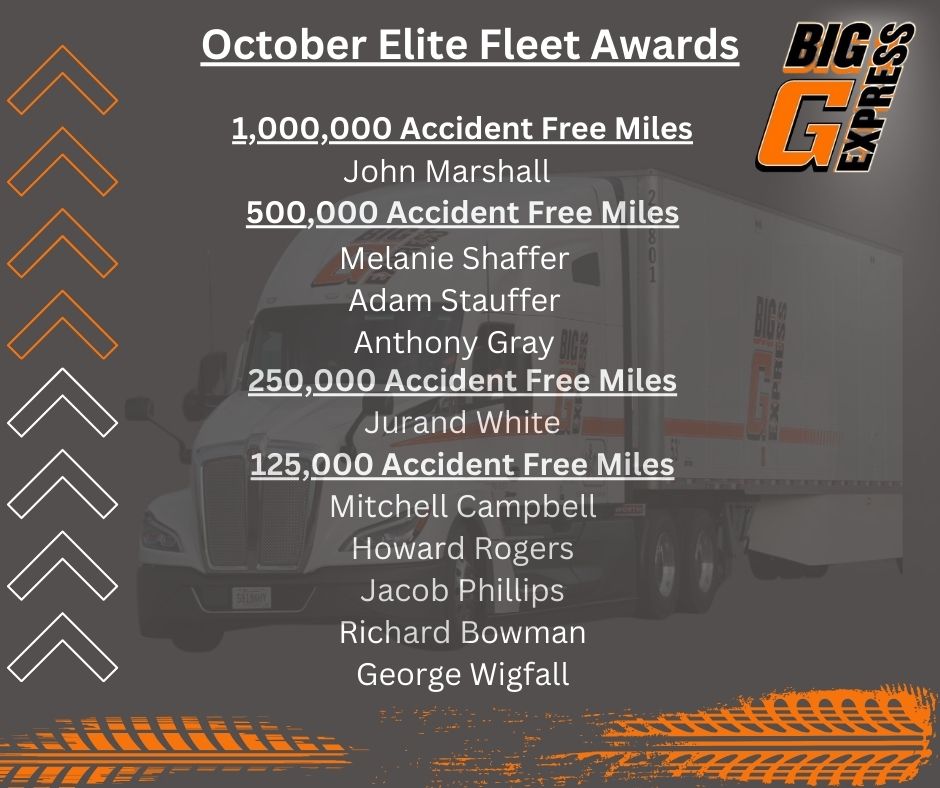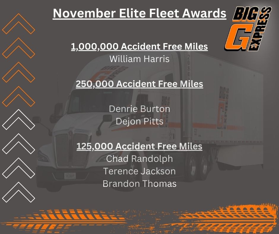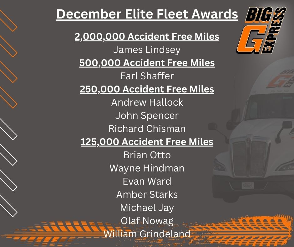 Congratulations to the following Big G Express Elite Fleet Drivers in 2025. We appreciate your hard work and dedication!
